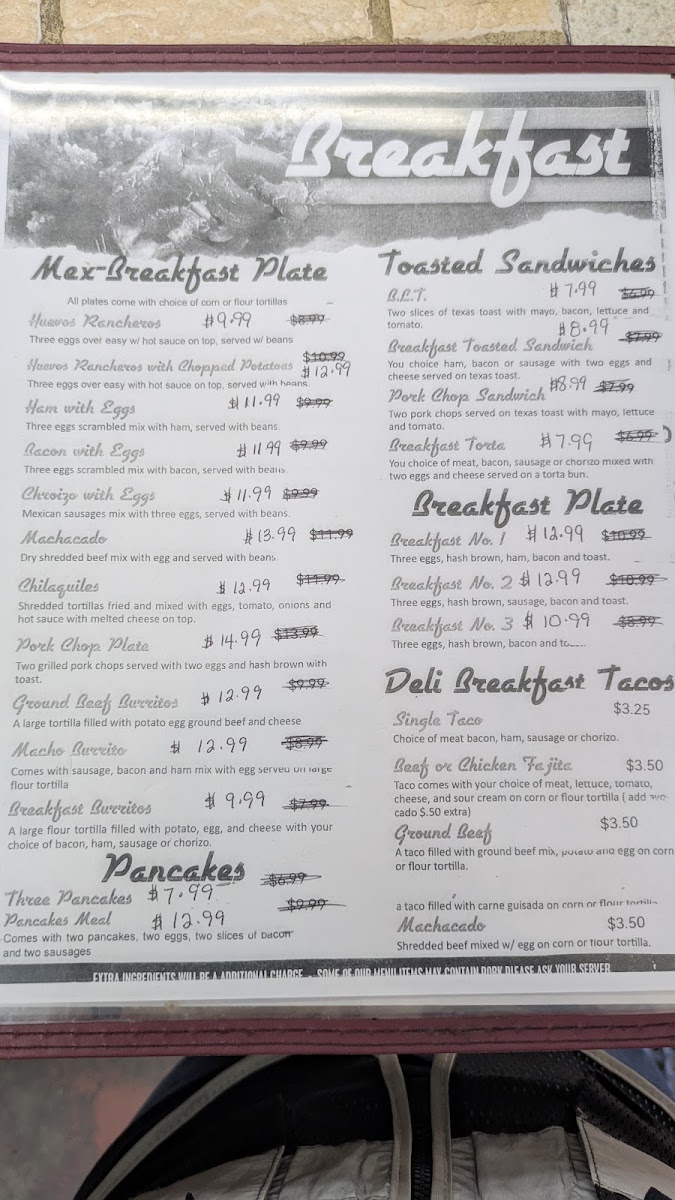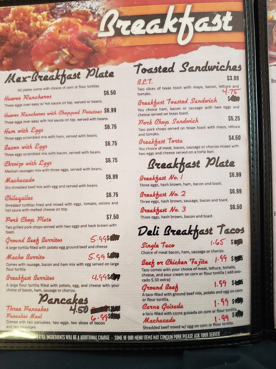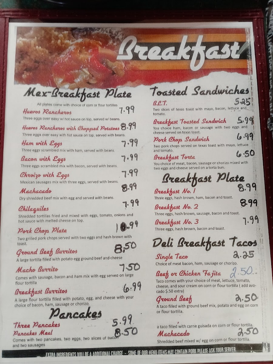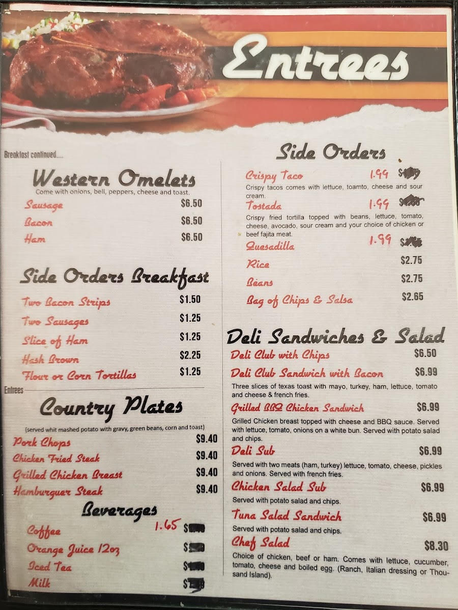 Breakfast favorites like the Breakfast Plate or Huevos Rancheros provide a warm and filling start, while lunchtime selections such as the Chicken Fried Steak, Al Pastor tacos, or freshly made toasted sandwiches offer familiar flavors with a home-cooked feel. From gyro wraps to four steak tacos, the menu covers a range of comforting bites good for casual meals or quick bites with friends and family.